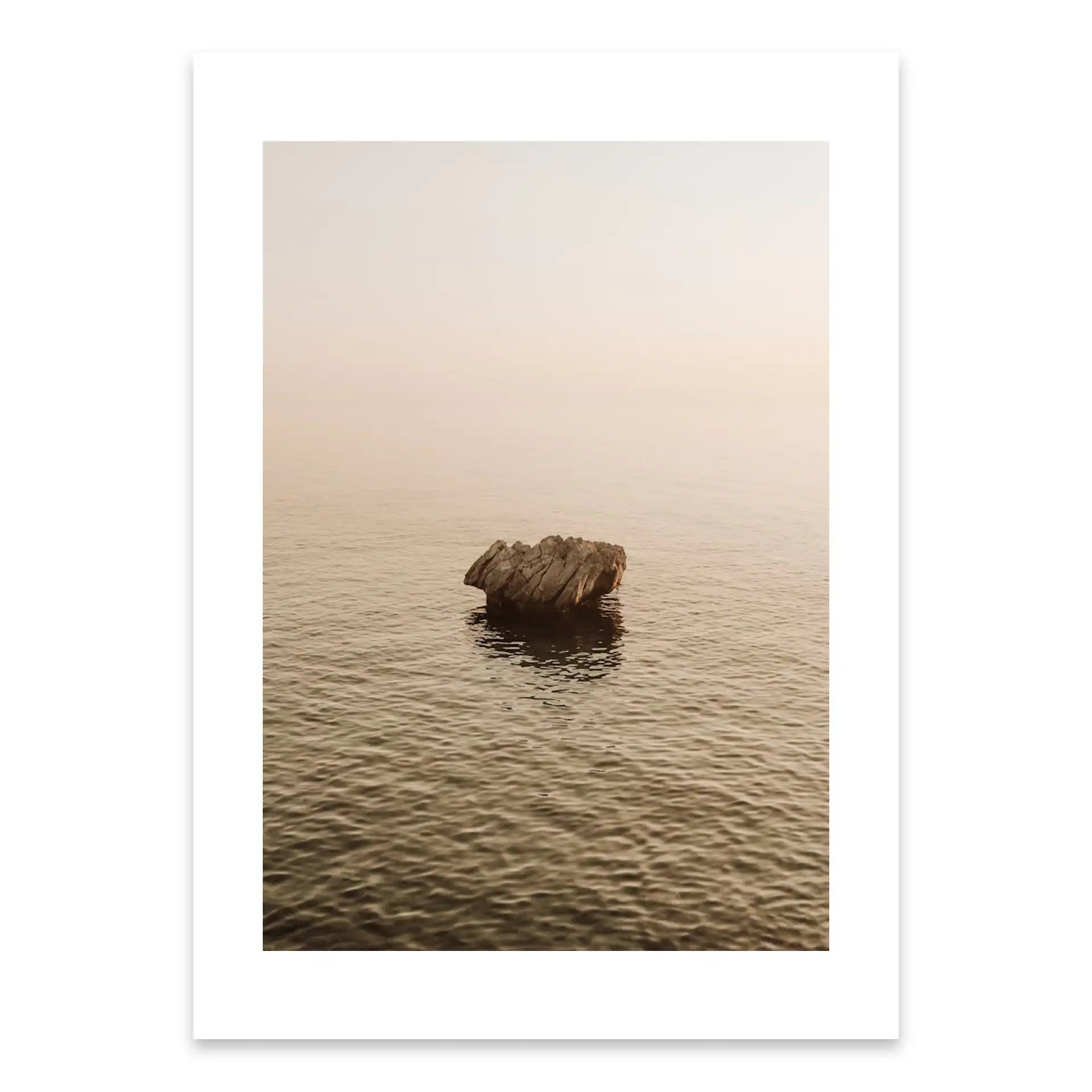 Die künstlerische monochrome bernsteinfarbene Fotografie zeigt einen einzelnen Felsen, der aus einer ruhigen Wasseroberfläche emporragt, während sich der Himmel in sanften Pastelltönen über dem Horizont ausbreitet. Die Wasseroberfläche ist leicht gekräuselt und reflektiert die Textur des Felsens. Die minimalistische Komposition betont die Ruhe der Szene und den Kontrast zwischen der harten Struktur des Steins und der sanften Weite des Wassers. Stilistisch erinnert die Aufnahme an die Ästhetik des Minimalismus, der sich durch eine Reduktion auf das Wesentliche auszeichnet. Der Fokus auf eine einzelne Form in einem ansonsten leeren Raum evoziert eine ähnliche Wirkung wie Werke des japanischen Zen-Buddhismus, der in der Kunst häufig durch schlichte, aber bedeutungsvolle Arrangements Ausdruck findet. Auch errinnert diese Darstellung an die Ästhetik des japanischen Wabi-Sabi, welche die Schönheit im Unvollkommenen und Vergänglichen findet. Die ruhige und meditative Stimmung des Bildes steht auch mit der Zen-Philosophie in Verbindung, welche Einfachheit und Ruhe schätzt.