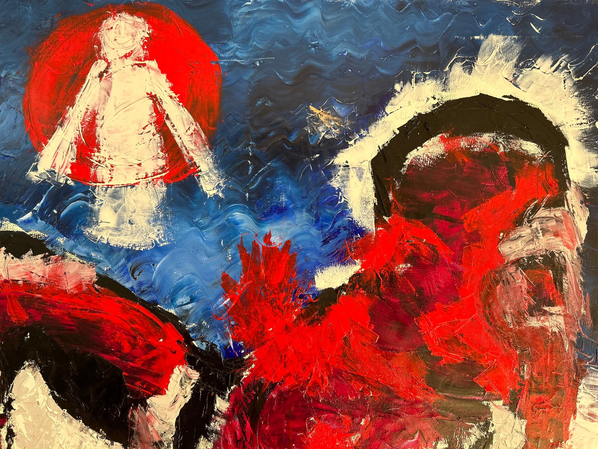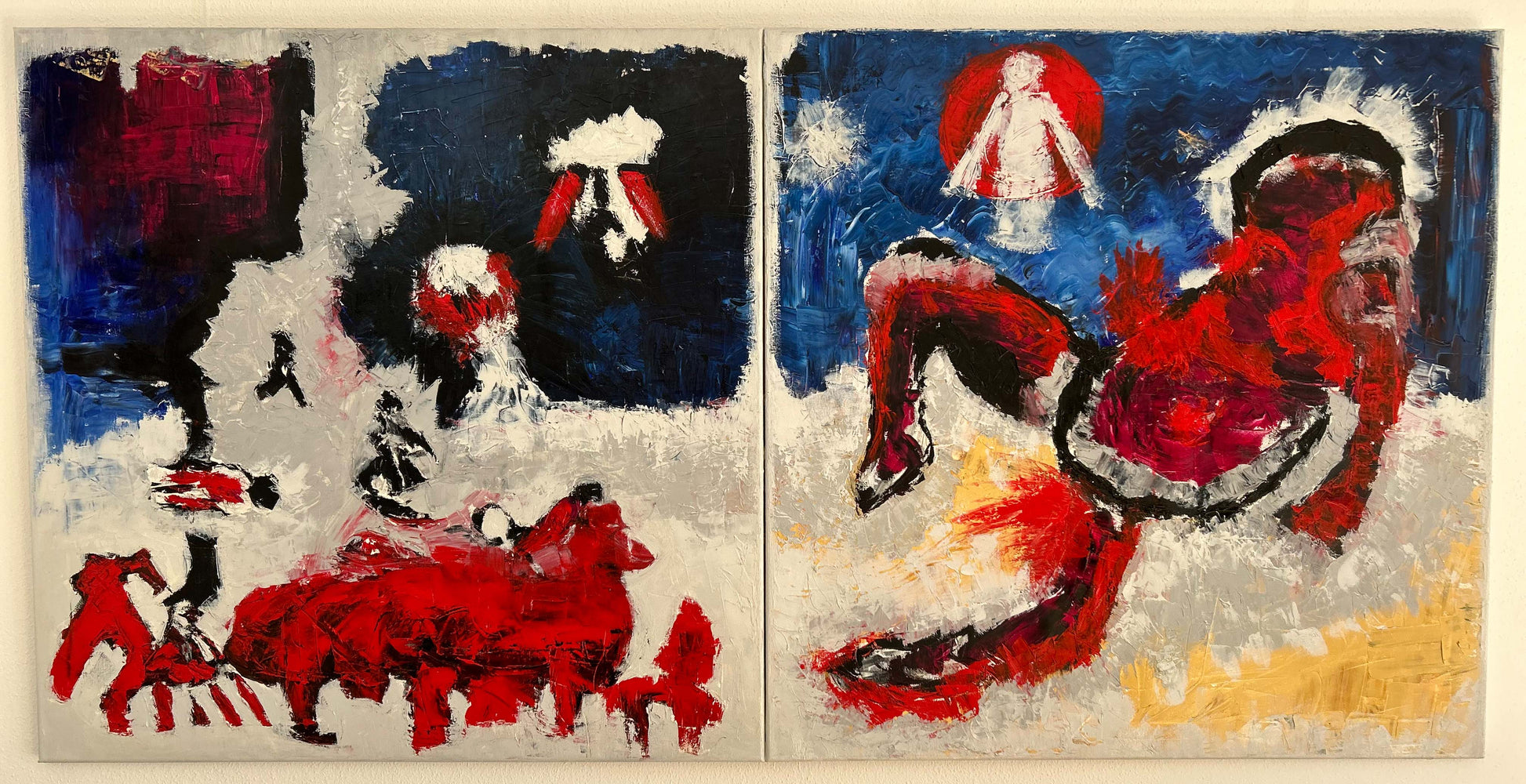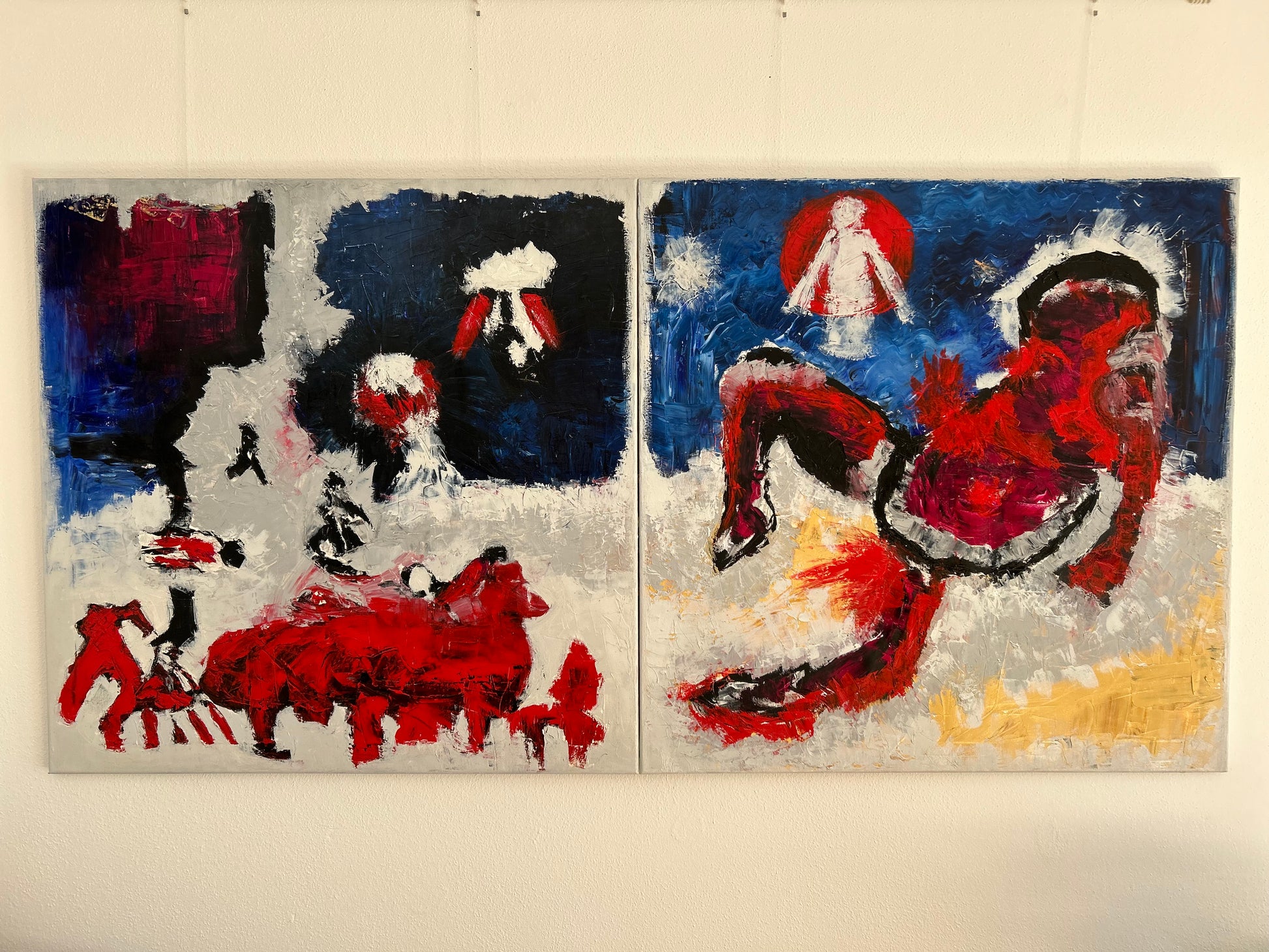 Martin Burris "Der Mensch, Krieg, Leiden und Tod" ist ein mehrteiliges Altarbild, das aus zwei Gemälden in Blau, Rot und Weiß besteht, jeweils 100 x 100 cm groß. Die kräftigen Hell-Dunkel-Kontraste und biblische Ikonographie zeichnen eine Kriegsszene, die sowohl realistisch als auch allegorisch ist. Das linke Bild zeigt Soldaten und Zivilisten inmitten von Feuer, Rauch und Blut, eine Anspielung auf die Schlachten der Weltkriege oder kommenden Kriege. Das rechte Bild zeigt eine verwundete oder tote Person. Eine zentrale Figur, der gekreuzigte Christus in einem weißen Gewand, verbindet die beiden Gemälde und symbolisiert Opfer, Leiden und Erlösung sowie die Menschlichkeit und Hoffnung auf Frieden. Burri verwendet einen strukturierten expressionistischen Stil mit dicken Pinselstrichen, Farbspritzern und Kratzern, um Bewegung, Chaos und Emotion zu erzeugen. Der Kontrast zwischen Licht und Dunkelheit sowie zwischen Leben und Tod wird durch negative Räume hervorgehoben. Das Werk weist deutliche Einflüsse des deutschen Expressionismus auf, insbesondere von Künstlern wie Ernst Ludwig Kirchner und Emil Nolde, deren Arbeiten ebenfalls durch intensive Farben und emotionale Ausdruckskraft gekennzeichnet sind. Darüber hinaus lassen sich Parallelen zu den dramatischen, figürlichen Darstellungen von Francis Bacon erkennen, besonders in der Darstellung von Schmerz und existenzieller Angst. Insgesamt ist das Werk eine kraftvolle und bedrückende Darstellung von Krieg, Leid und Tod, die durch ihre intensive Farbgebung und expressive Malweise eine starke emotionale Wirkung erzielt. Das Gemälde regt den Betrachter dazu an, über die Schrecken des Krieges, die Not der Flüchtlinge und die Rolle der Religion nachzudenken und gleichzeitig auf eine bessere Zukunft zu hoffen.