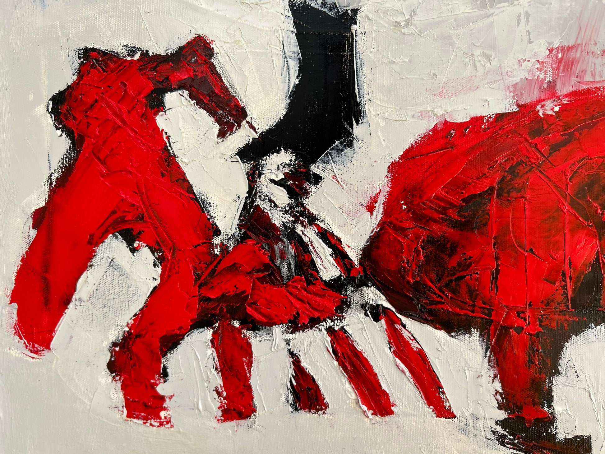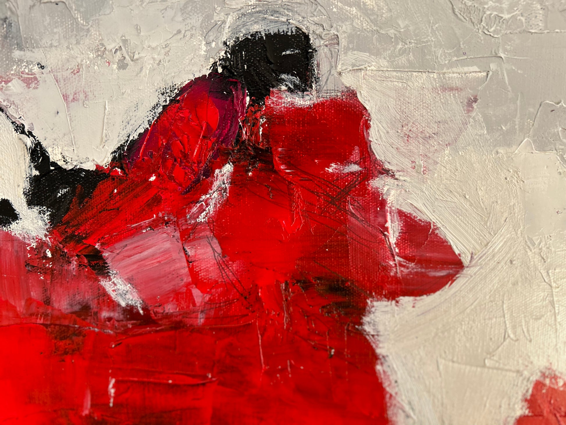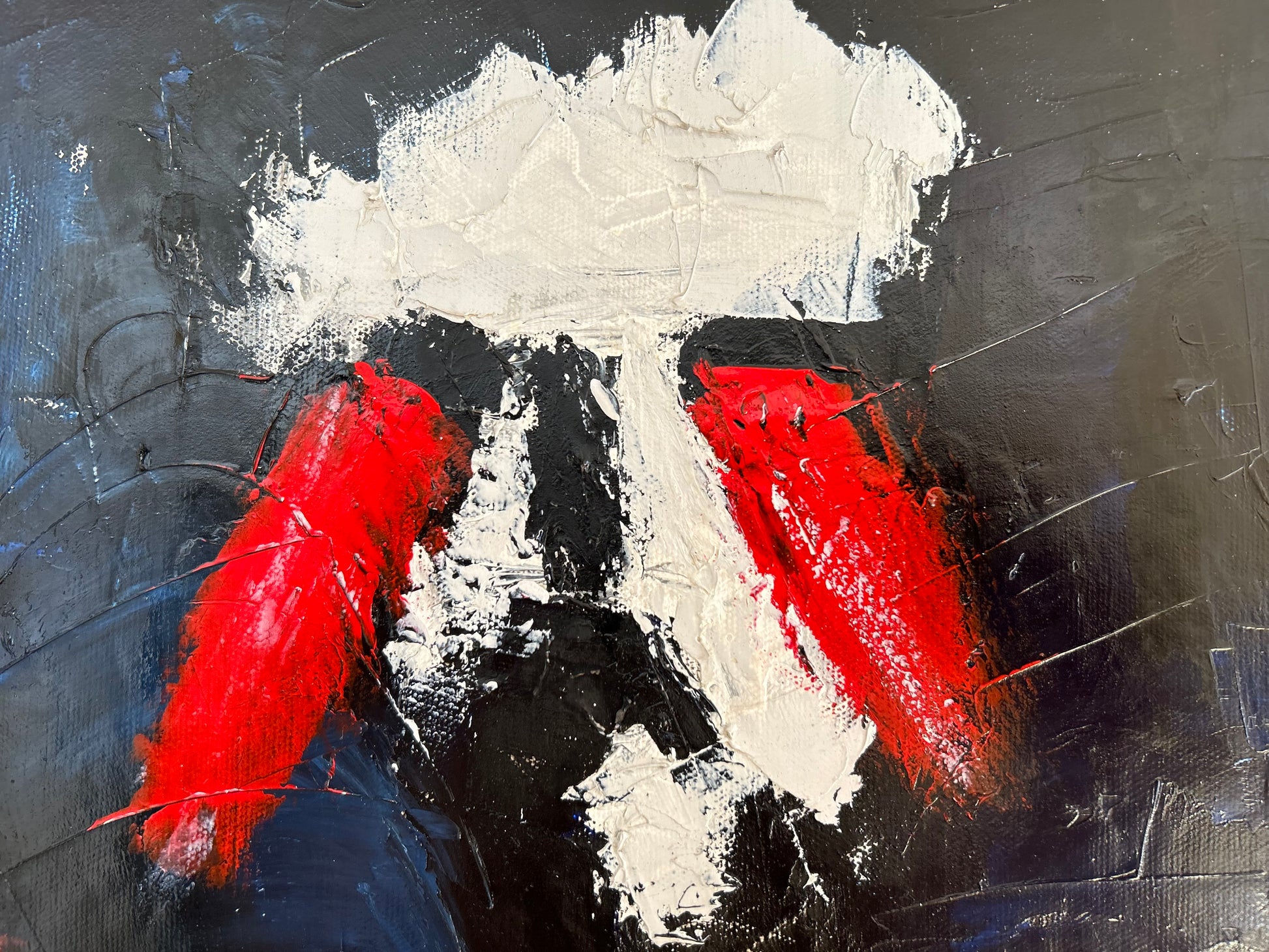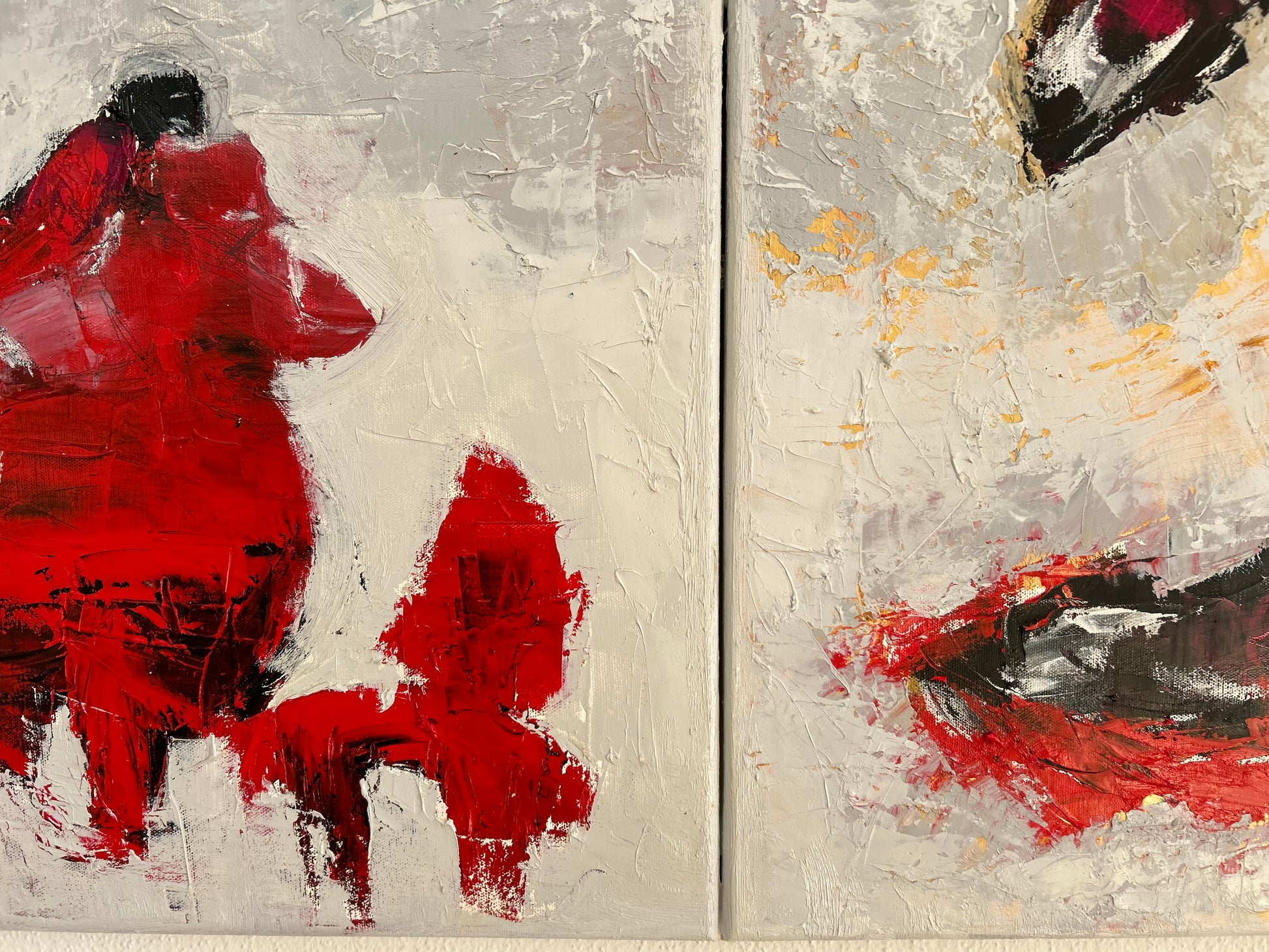 Martin Burris "Der Mensch, Krieg, Leiden und Tod" ist ein mehrteiliges Altarbild, das aus zwei Gemälden in Blau, Rot und Weiß besteht, jeweils 100 x 100 cm groß. Die kräftigen Hell-Dunkel-Kontraste und biblische Ikonographie zeichnen eine Kriegsszene, die sowohl realistisch als auch allegorisch ist. Das linke Bild zeigt Soldaten und Zivilisten inmitten von Feuer, Rauch und Blut, eine Anspielung auf die Schlachten der Weltkriege oder kommenden Kriege. Das rechte Bild zeigt eine verwundete oder tote Person. Eine zentrale Figur, der gekreuzigte Christus in einem weißen Gewand, verbindet die beiden Gemälde und symbolisiert Opfer, Leiden und Erlösung sowie die Menschlichkeit und Hoffnung auf Frieden. Burri verwendet einen strukturierten expressionistischen Stil mit dicken Pinselstrichen, Farbspritzern und Kratzern, um Bewegung, Chaos und Emotion zu erzeugen. Der Kontrast zwischen Licht und Dunkelheit sowie zwischen Leben und Tod wird durch negative Räume hervorgehoben. Das Werk weist deutliche Einflüsse des deutschen Expressionismus auf, insbesondere von Künstlern wie Ernst Ludwig Kirchner und Emil Nolde, deren Arbeiten ebenfalls durch intensive Farben und emotionale Ausdruckskraft gekennzeichnet sind. Darüber hinaus lassen sich Parallelen zu den dramatischen, figürlichen Darstellungen von Francis Bacon erkennen, besonders in der Darstellung von Schmerz und existenzieller Angst. Insgesamt ist das Werk eine kraftvolle und bedrückende Darstellung von Krieg, Leid und Tod, die durch ihre intensive Farbgebung und expressive Malweise eine starke emotionale Wirkung erzielt. Das Gemälde regt den Betrachter dazu an, über die Schrecken des Krieges, die Not der Flüchtlinge und die Rolle der Religion nachzudenken und gleichzeitig auf eine bessere Zukunft zu hoffen.