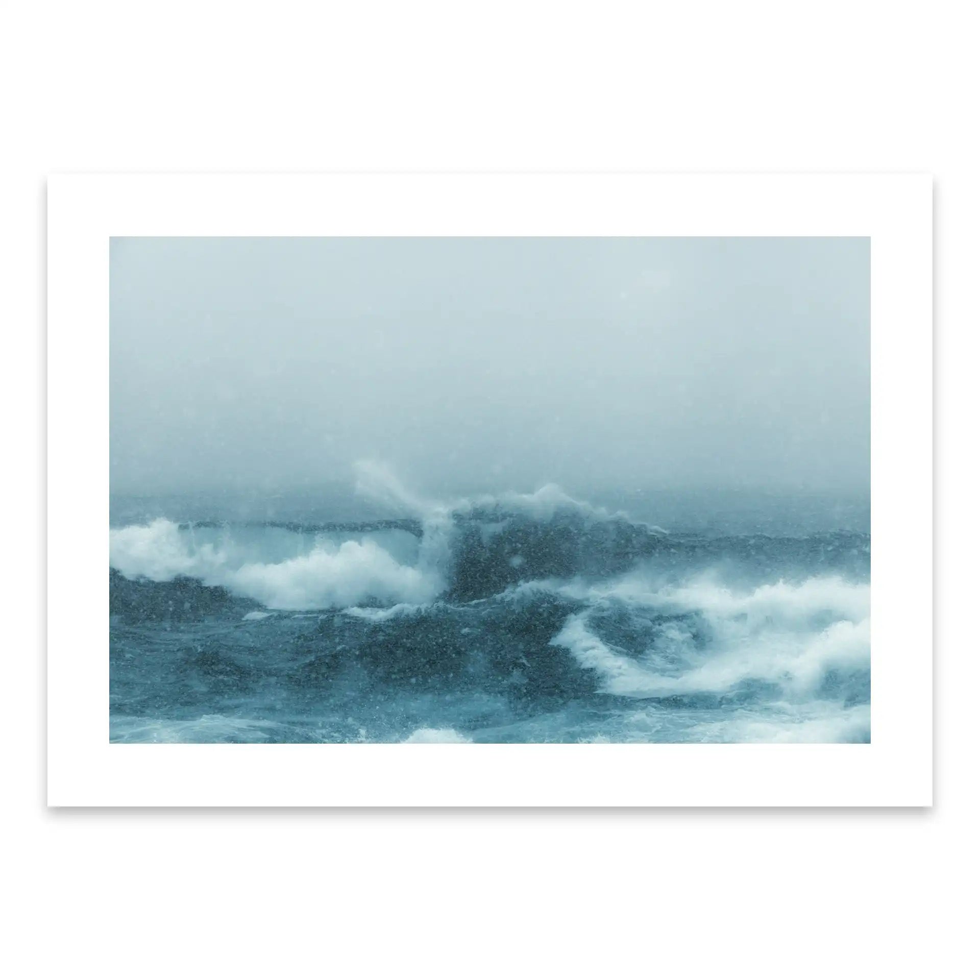 Die künstlerische Fotografie zeigt eine stürmische Meereslandschaft in kühlen Blau- und Grautönen. Dynamische Wellen, diffuse Lichtführung und neblige Atmosphäre betonen das Erhabene und verweisen auf romantische Vorbilder wie Caspar David Friedrich und William Turner ebenso wie auf die sachliche Klarheit der Neuen Sachlichkeit. Die Bildsprache rückt die Natur als autonomes, unnahbares Gegenüber ins Zentrum und verzichtet auf menschliche oder narrative Elemente. So entsteht eine nüchterne, kontemplative Auseinandersetzung mit der überwältigenden Naturgewalt.