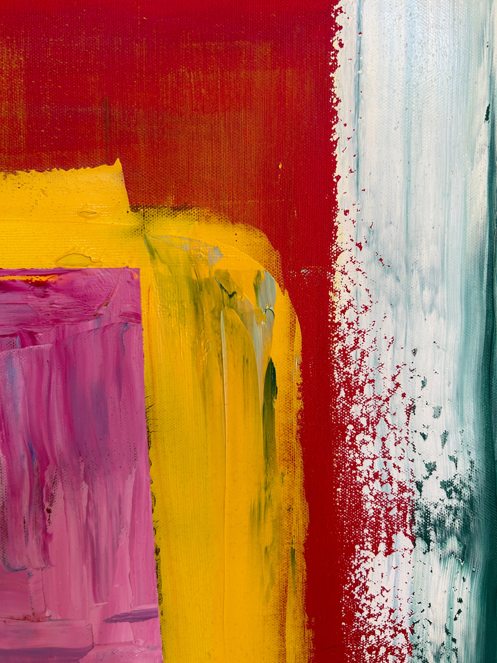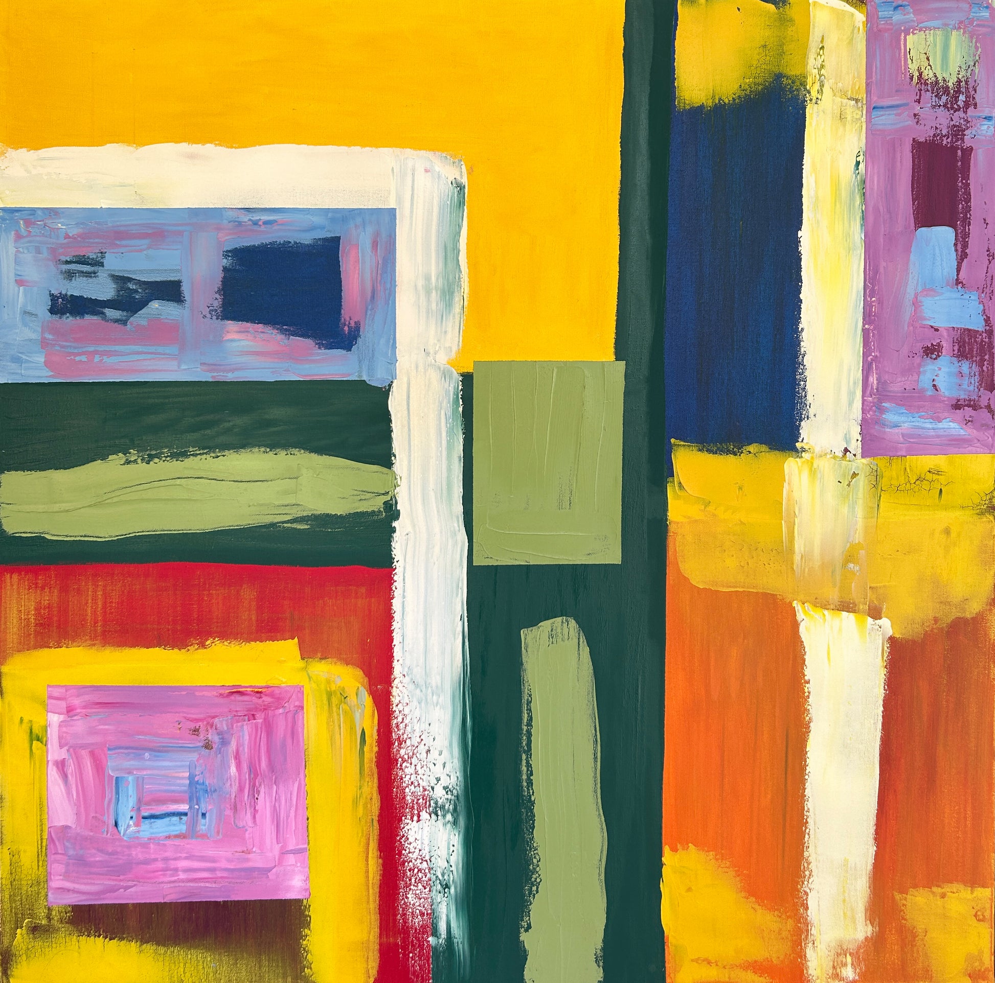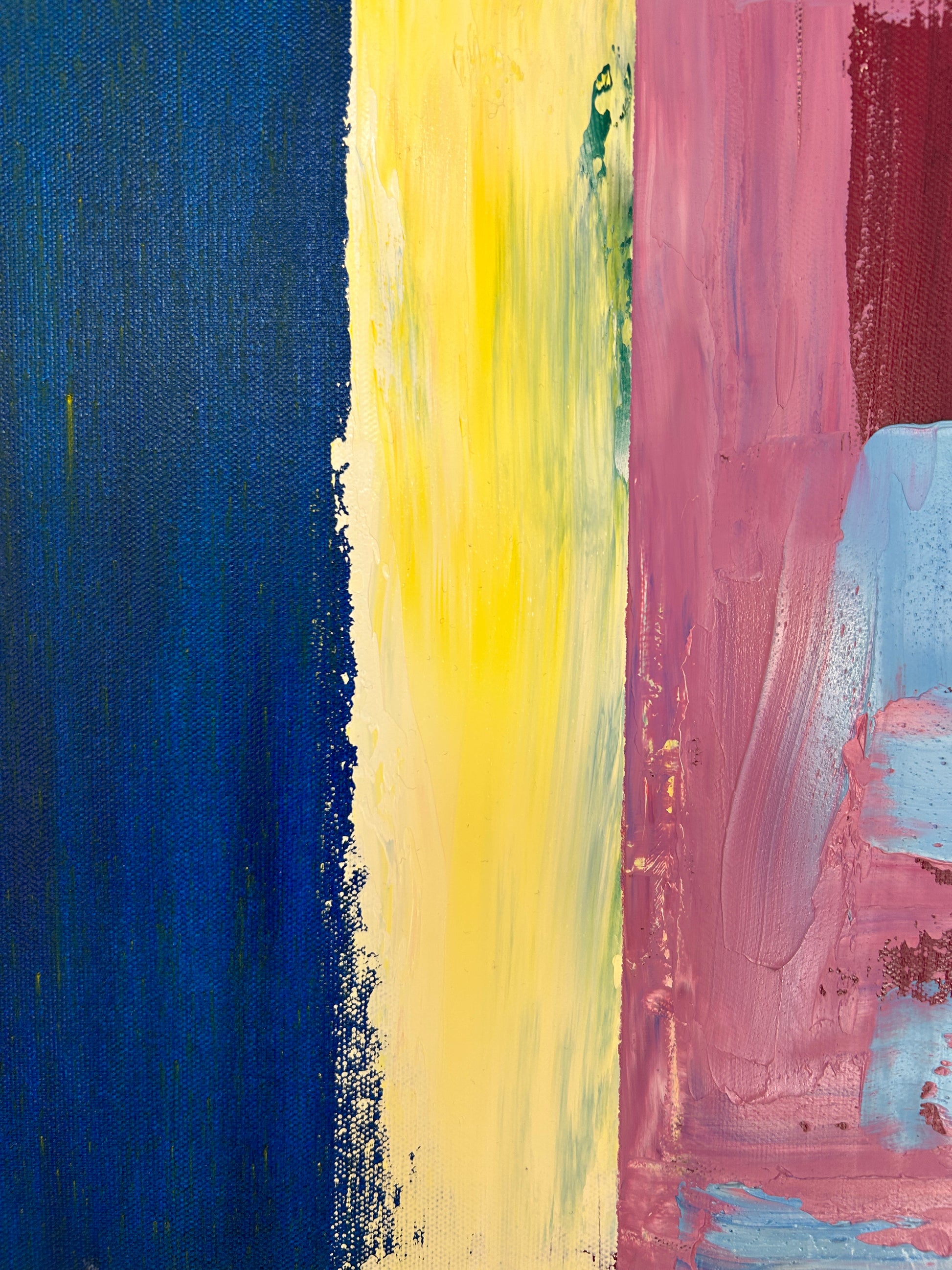 Das Gemälde "Zustand 1" von Martin Burri stellt eine abstrakte Komposition dar, die durch eine Anordnung von Farbblöcken und -streifen in unterschiedlichen Größen und Formen gekennzeichnet ist. Die dominierenden Farben sind Gelb, Orange, Rot, Grün und Blau in verschiedenen Schattierungen. Die Farbanwendung variiert zwischen texturierten und glatten Oberflächen. Die künstlerische Ausführung und die Betonung auf Farbflächen wecken Assoziationen zum abstrakten Expressionismus, insbesondere an die Werke von Mark Rothko oder Barnett Newman, die für ihre Farbfeldmalerei bekannt sind. Die klare Abgrenzung zwischen den einzelnen Farbfeldern deutet auf den Post-Painterly Abstractionismus hin, eine Bewegung, die sich durch eine deutliche Trennung der Farbflächen auszeichnet. Die offene Interpretation des Bildes lädt den Betrachter dazu ein, eigene emotionale oder intellektuelle Reaktionen zu projizieren, ohne eine narrative Richtung vorzugeben. Die Balance zwischen den verschiedenen Elementen sowie das Spiel mit Proportion und Raum bieten Diskussionspunkte für kunsthistorische Betrachtungen. Die Komposition reflektiert die Tendenz der modernen Kunst, den Betrachter aktiv in den Interpretationsprozess einzubeziehen.