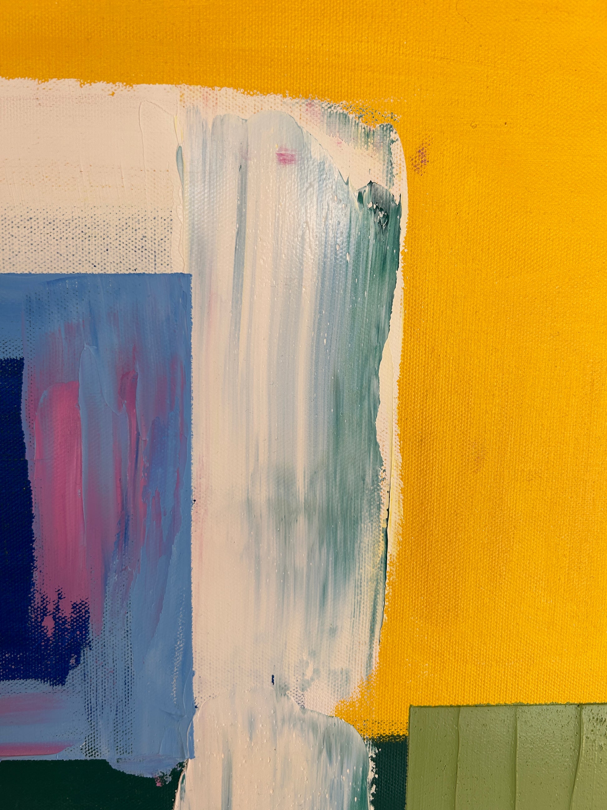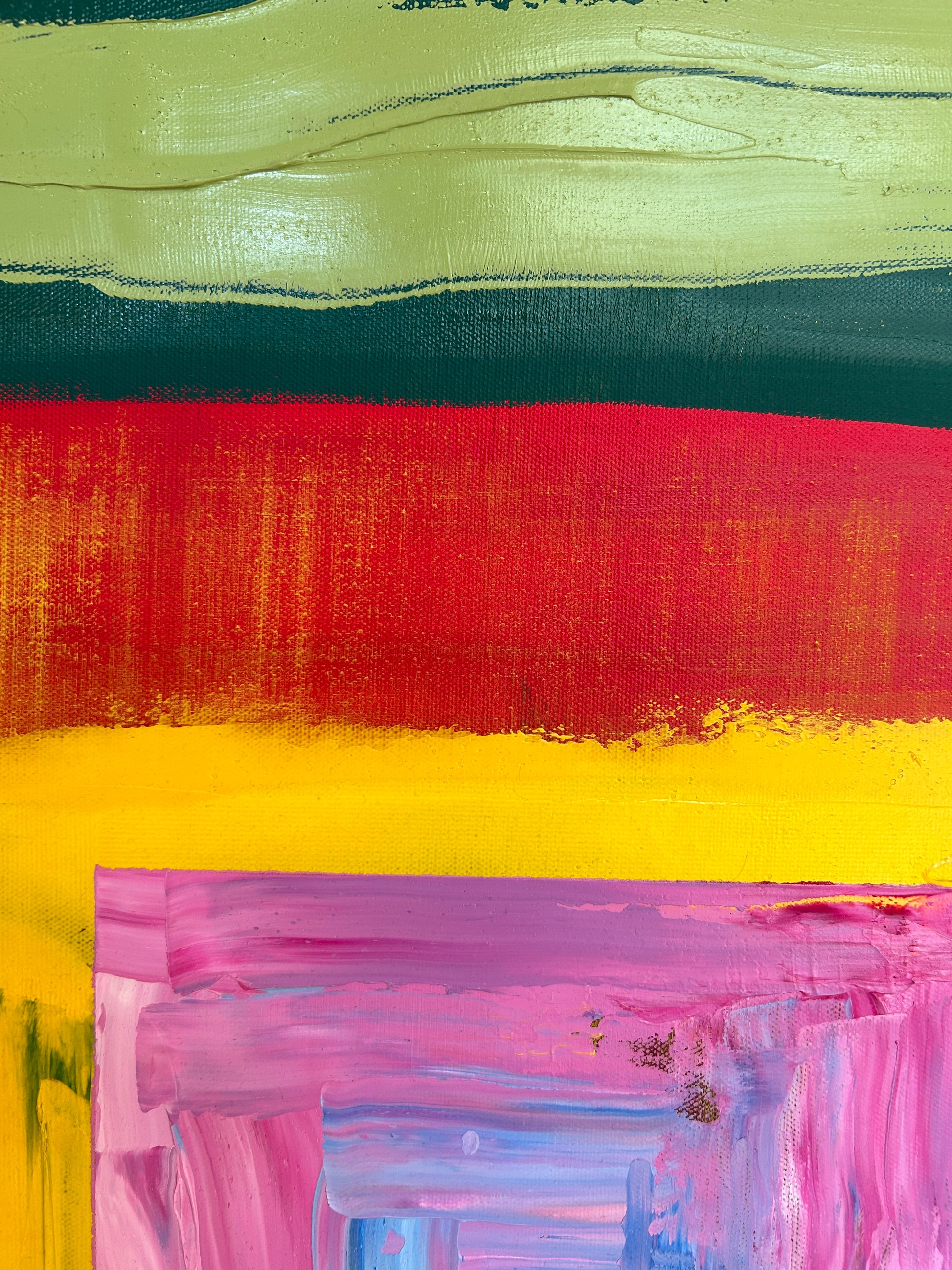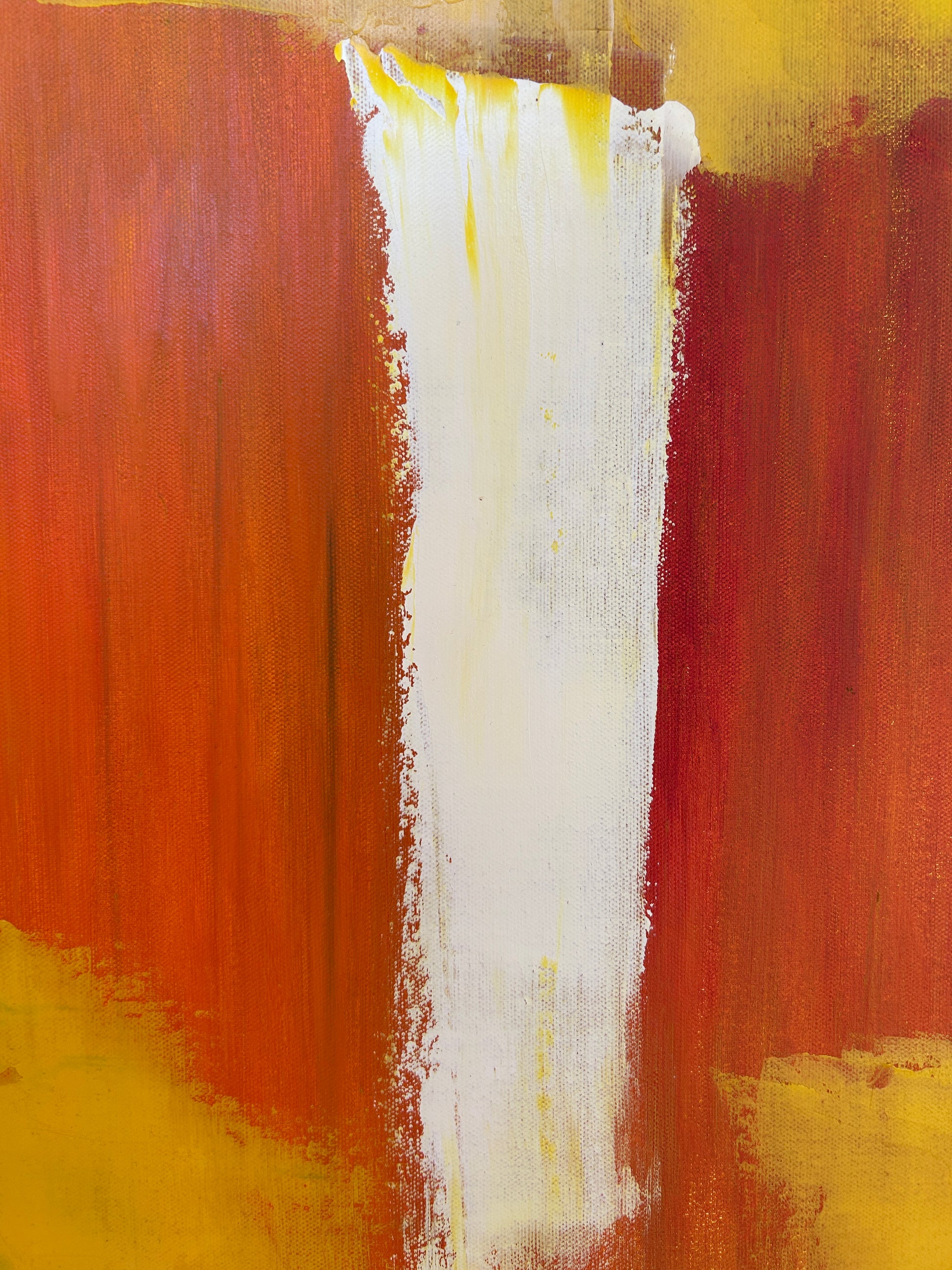 Das Gemälde "Zustand 1" von Martin Burri stellt eine abstrakte Komposition dar, die durch eine Anordnung von Farbblöcken und -streifen in unterschiedlichen Größen und Formen gekennzeichnet ist. Die dominierenden Farben sind Gelb, Orange, Rot, Grün und Blau in verschiedenen Schattierungen. Die Farbanwendung variiert zwischen texturierten und glatten Oberflächen. Die künstlerische Ausführung und die Betonung auf Farbflächen wecken Assoziationen zum abstrakten Expressionismus, insbesondere an die Werke von Mark Rothko oder Barnett Newman, die für ihre Farbfeldmalerei bekannt sind. Die klare Abgrenzung zwischen den einzelnen Farbfeldern deutet auf den Post-Painterly Abstractionismus hin, eine Bewegung, die sich durch eine deutliche Trennung der Farbflächen auszeichnet. Die offene Interpretation des Bildes lädt den Betrachter dazu ein, eigene emotionale oder intellektuelle Reaktionen zu projizieren, ohne eine narrative Richtung vorzugeben. Die Balance zwischen den verschiedenen Elementen sowie das Spiel mit Proportion und Raum bieten Diskussionspunkte für kunsthistorische Betrachtungen. Die Komposition reflektiert die Tendenz der modernen Kunst, den Betrachter aktiv in den Interpretationsprozess einzubeziehen.